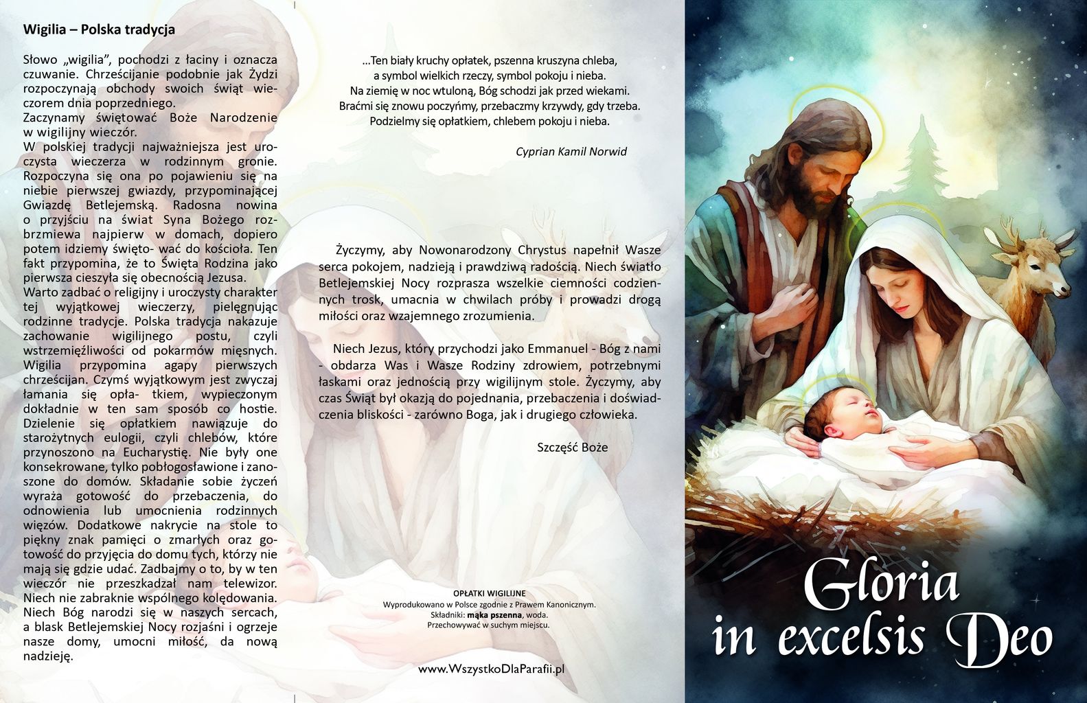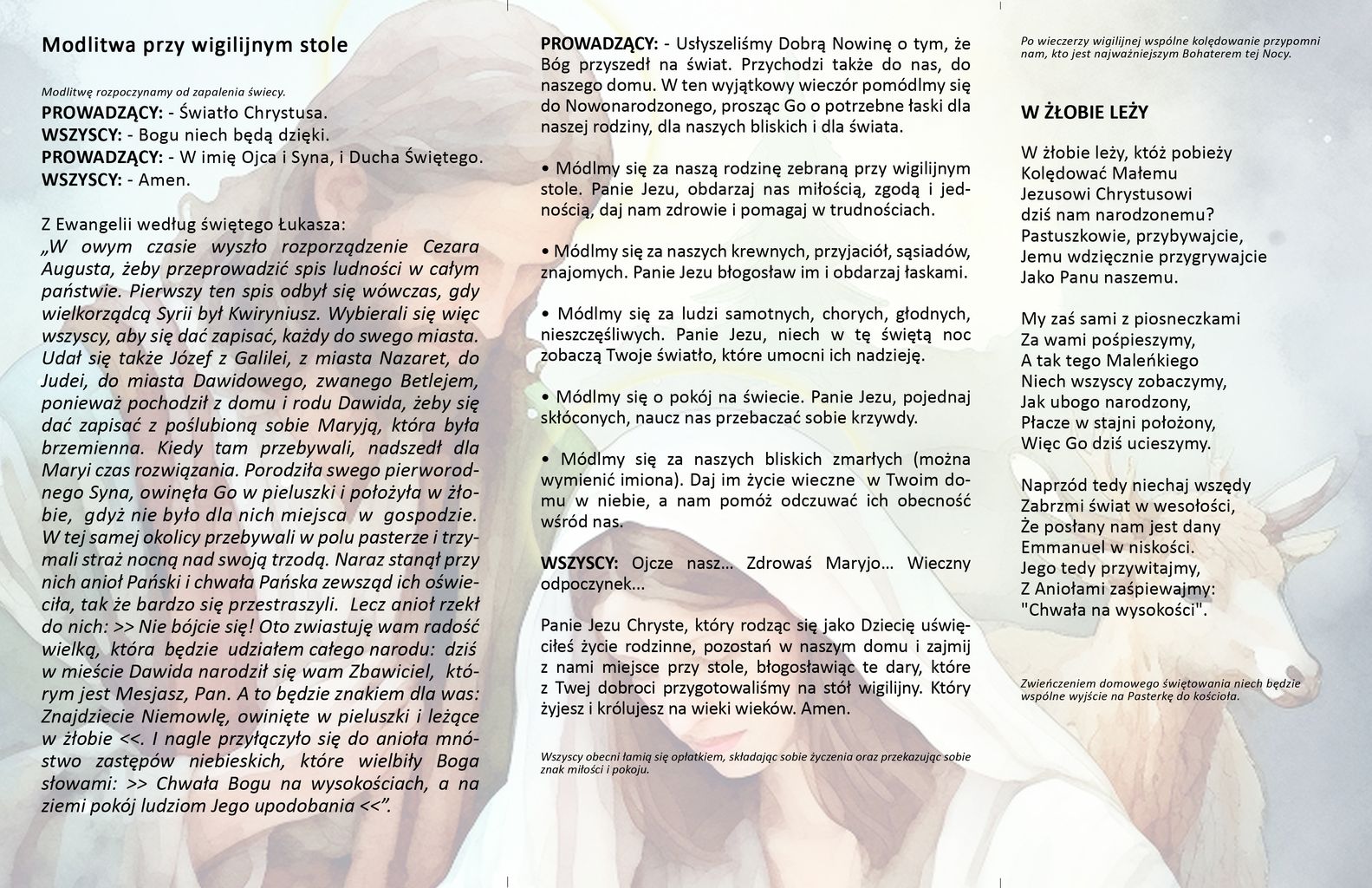 O tym Słowie przy Stole Wigilijnym chcemy przypominać i ubogacać tradycyjne łamanie się opłatkiem. W związku z tym zestaw opłatków wigilijnych opatrzony jest w przepiękny obrzęd Wieczerzy Wigilijnej prowadzący wszystkich przez fragment Ewangelii św. Łukasza mówiący o Cudzie Narodzenia wraz z dalszym pogłębieniem modlitewnym za wszystkich Domowników i Rodzinę, aż po tekst tradycyjnej kolędy do wspólnego celebrowania tej wyjątkowej Nocy.