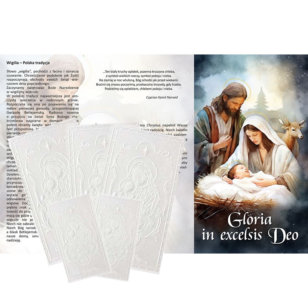 O tym Słowie przy Stole Wigilijnym chcemy przypominać i ubogacać tradycyjne łamanie się opłatkiem. W związku z tym zestaw opłatków wigilijnych opatrzony jest w przepiękny obrzęd Wieczerzy Wigilijnej prowadzący wszystkich przez fragment Ewangelii św. Łukasza mówiący o Cudzie Narodzenia wraz z dalszym pogłębieniem modlitewnym za wszystkich Domowników i Rodzinę, aż po tekst tradycyjnej kolędy do wspólnego celebrowania tej wyjątkowej Nocy.