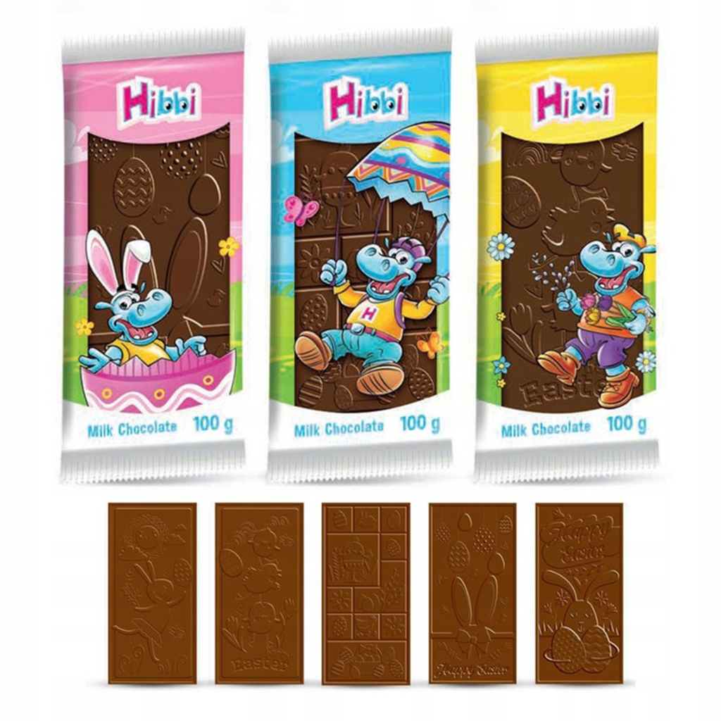 Czekolada mleczna Hibbi w wielkanocnej edycji - delikatna czekolada mleczna zamknięta w tabliczkę z wielkanocnymi motywami. MIX wzorów i kolorów - wysyłany losowo.